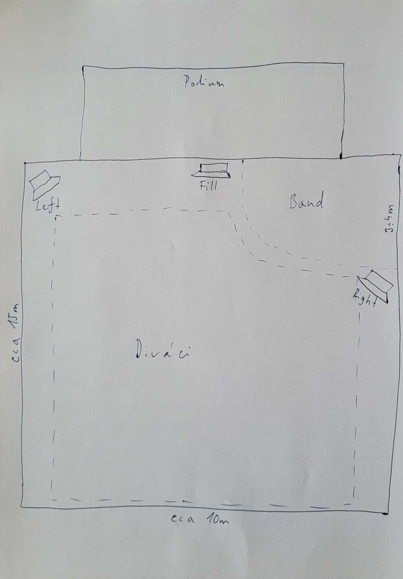 používám ve středu shodnou 3-tí bednu na ležato jako Fill viz. náčrtek. Left a Fill bez zpoždění na Right delay. Bedny klasika 90x60°vyzařování Fill nemá otočnou hornu tzn. vyzařuje 60°H. Pokud bych použil jen 2 PA bedny s rozptylem 100°H na pozici L a R bez Fill - je reálné, že to vykryjí podobně?