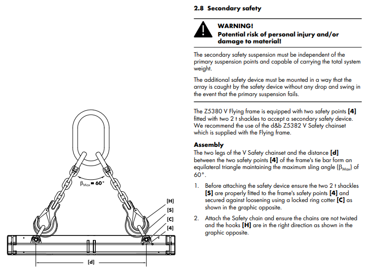 V případě věšení PA na single point, tak buď přes D8+ motor (s dvojí brzdou) a nebo přes obyčejný motor doplněný o safety chain set (viz rigging manuál od každýho výrobce PA) doplněný o steelflex a další věci, který mi dá rigger podle jeho potřeby.