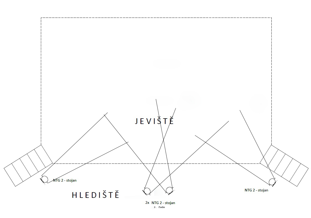 Chystám se dělat záznam inscenace jednoho amatérského souboru. Mělo by se jednat o videozáznam. Potřeboval bych poradit ohledně rozmístění a výběru mikrofonů. Jedná se o klasické vyvýšené jeviště. Ze zkoušek již vím, že není možné dát hercům mikroporty (což by pro mě bylo samozřejmě nejjednodušším řešením), protože hra je dosti nabitá nebezpečnými pohybovými akcemi (časté pády, rvačky). S tím souvisí i další problém, nemůžu mikrofony umístit na forbínu na nízké stojánky, protože se herecká akce často odehrává na samotné hraně jeviště. Navíc tam lítá a padá spousta rekvizit a tak by byly jednak ohroženy mikrofony a jednak by byly omezeni samotní herci v projevu, což bych velice nerad. Mám jeden návrh řešení. K dispozici mám 4x směrový mikrofon RODE NTG-2. Na každý kraj jeviště bych umístil jeden mikrofon, aby směřoval mírně šikmo do středu jeviště. Mikrofony budou na stojanech umístěny zhruba necelý metr od vyvýšeného jeviště. Doprostřed jeviště (resp. před jeviště) bych umístil na stojanech zbylé dva mikrofony do kříže, aby záběr směrových mikrofonů byl větší. Myslíte si, že je toto řešení přijatelné? S klasickou NTG-2 mám docela dobrou zkušenost. I když je to sice směrový mikrofon, pokud bych ho nepřiplácl přímo k jevišti, ale dál, záběr tohoto směrového mikrofonu by byl větší. V příloze schéma rozmístění mikrofonů.