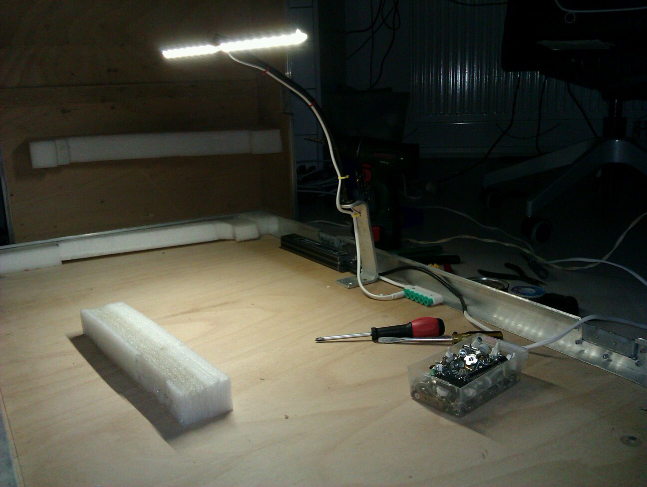 Je-li někde (z pultu) k dispozici +12V, jde udělat svítítko z LED pásku (prodává GM, GES aj.). Ty pásky kromě diod obsahují i předřadné odpory, takže se připojují přímo na stejnosměrných 12V. (Je to legrace, když kupujete např. 0,5m diod.) Pásek je samolepící, takže se jen přilepí např na hliníkovou lištu- nejlépe korýtko - , připájí dva dráty, které se zapojí někam k těm 12 Voltům. Na 0,5m pásku (asi třicet svítivek) počítejte s odběrem asi 0,3A - v případě bílých diod. Mechanicky už musí každý sám. Minimální délka, kterou jde koupit je 5cm - 3 diody, které pak mají spotřebu asi 0,03A, (ke 12V se připojují vždy, s počtem diod roste jen spotřeba proudu). Něco obdobného - hotová lampička na notový stojan s klipsnou i tráfkem se prododává za asi 1000,-Kč u hudebních nástrojů. Jiné řešení se samostanými diodami je např. 2 svítivky zapojené v serii, nebo i paralelně (zde se dá bezpečně experimentovat!) napájené z nepožívané dobíječky k mobilům. (Má je doma snad každý.)