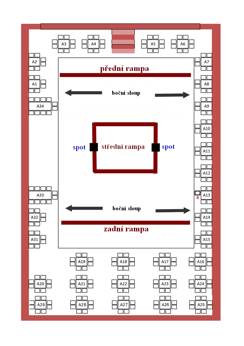 Na druhé fotce jsem se pokusil překreslit plánek sálu přesněji a zakreslil jsem tam i rampy.