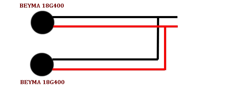 Každé repro má jednu výhybku. uvnitř je 2 x BEYMA 18G400 1600Wat/8Ohm. Zapojení dle přílohy. Aktuálně zapojuji dvě bedny za sebe
