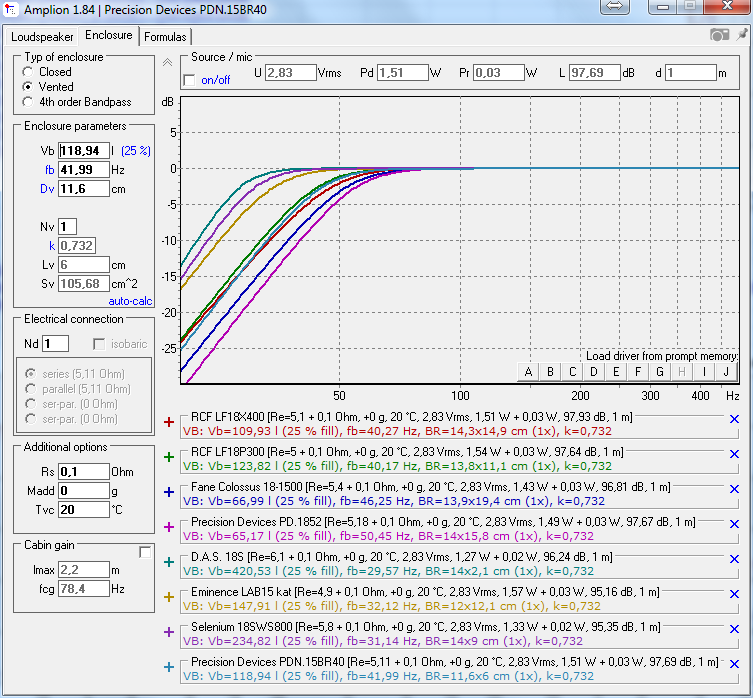 Co se týká konkrétních modelů, tak těch je na výběr mnoho, já bych si to asi kvůli tomu subu pro začátek zúžil na Precision Devices, nejen kvůli vzhledu, ale i proto, že udávané T-S parametry jsou použitelné, dlouhodobě sedí skoro s každým ověřovacím měřením (naposledy myslím Vance Dickason, mají to na webu).