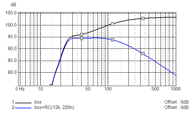 Nič nebráni použiť "podladený basreflex", napr. ten box s objemom 220l, s 2x15P1000Fe paralelne, basreflex naladený na cca 27Hz. A korekciu na signálovej strane, ide to veľmi jednoducho, stačí RC člen na vstupe konca, 12k v sérii a 220n do zeme. Xmax nebude prekročených až po cca 800W príkonu na 25Hz, čo stačí pre SPL 120dB/1m od 25Hz vyššie . Tá RC korekcia je len jednoduchý 6dB LP s f-3 asi na 60Hz (elektrická analógia pridania hmotnosti, bez nevýhod..), je možné to urobiť aj aktívne nejakým DSP (ak je k dispozícii) spolu s ďaľšími úpravami. Výsledok pre 2,83V na vstupe do boxu je na obrázku. Realita bude prakticky totožná. Akustiku miestnosti na basoch treba riešiť nejakým room EQ na základe meraní. To "kino" si to zaslúži..
