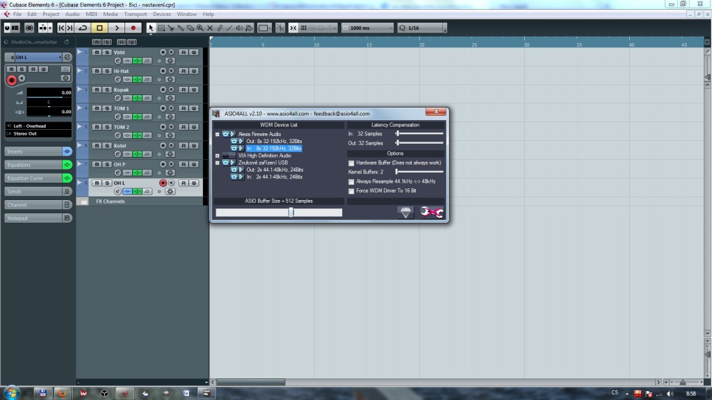 3. nainstaluj si ASIO ovladace, WDM je na filmy a hry, nie na nahravanie. Cubase ASIO podporuje - najlepsie ked stiahnes najnovsie z alesis.com, v nudzi by nejake mali byt aj na prilozenom CD.
