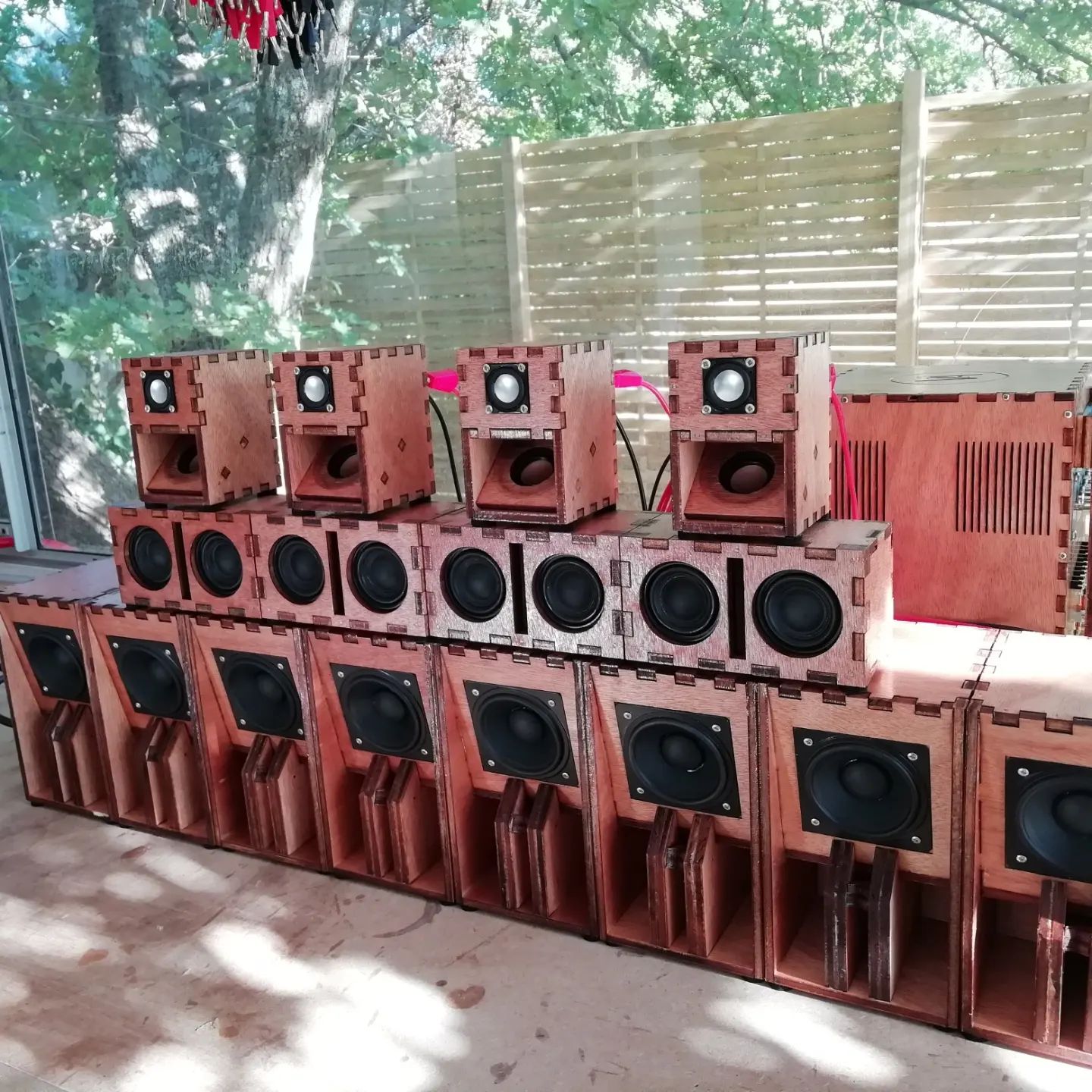 Moje otázka ale je jak to zapojit ve velkém doma dřív než půjdou do světa ..když bych si plánoval koupit 2 zesilovače /600w bass 4-8ohm/ + /600 střed 4-8ohm/..do toho koupit nejtlustší cinch rozříznout ho napůl a na něj napájet 40 a 40 ks dvojlinky 0,25... já vím mědi a mědi... použité repráčky mají všechny cca 2palce 2-15w 4-8 ohm viz odkazy... pokud máte někdo nějaké tipy.. hubenější dvojlinku nebo zesilovač do kterého můžu zamotat 40 káblíků nebo nějaké rozdvojky sem s nimi.. jsem jenom truhlář a ,,zvukovo/tlakový inženýr ne elektrikář.. za rady děkuji..