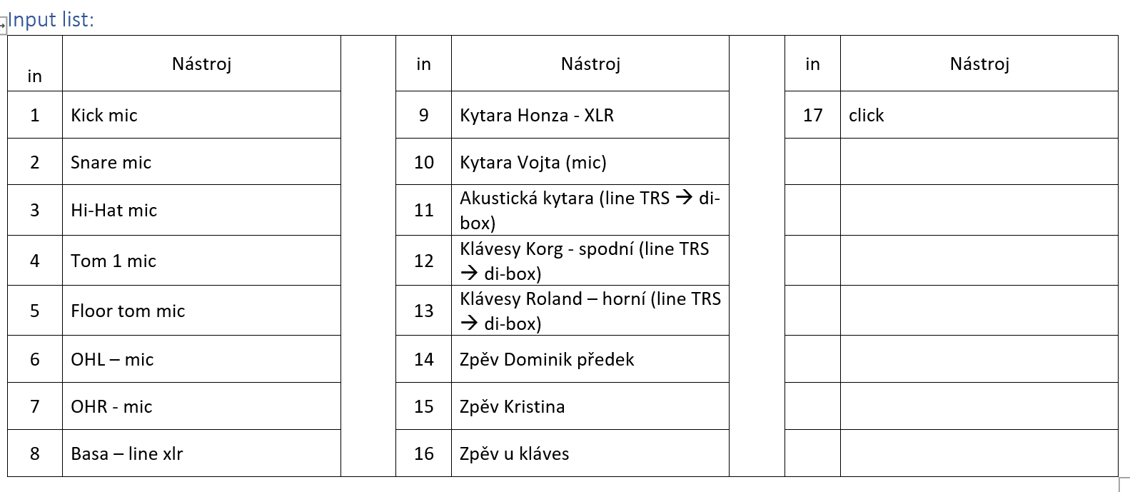 Popíšu současný stav v kapele. Jedná se o cover/párty/zábavovku v obsazení 2-3 zpěvy, basa, el. kytara, digi piano + synth se střídá s druhou kytarou, akustické bicí.