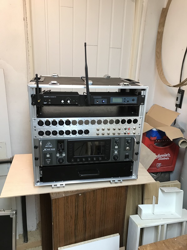 Co bych chtěl? Jeden rack (hmotnost neřeším), který by integroval mixpult, inear vysílače, splitter, rozplet k PA zvukaři, zásuvku na bodypacky, sluchátka a příslušenství, místo pro notebook.