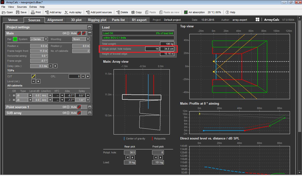 hele tak ono to vypadá, že skutečně člověk nemusí zadávat pickpoint a sledovat úhel jako u L-Ac., ale že v "SOURCES" jen zadám úhel Frame Angle a v záložce RIGGING PLOT software rovnou vyblije díru, na které to má viset, abych se na ten úhel dostal... jinak teda musím říct, že třeba "konstruování" poslechového prostoru v ArrayCalc je proti SoundVision úžasná pohoda - soft vyhodí defaultní obdélníček a taháš myší, nemusí člověk jak debil zadávat rohový body (pokaždý, když dělám "surface" v SV, začnu tím, že vytvořím "mašličku", protože si za boha nejsem schopnej zapamatovat, jak maj jít ty body po sobě...)