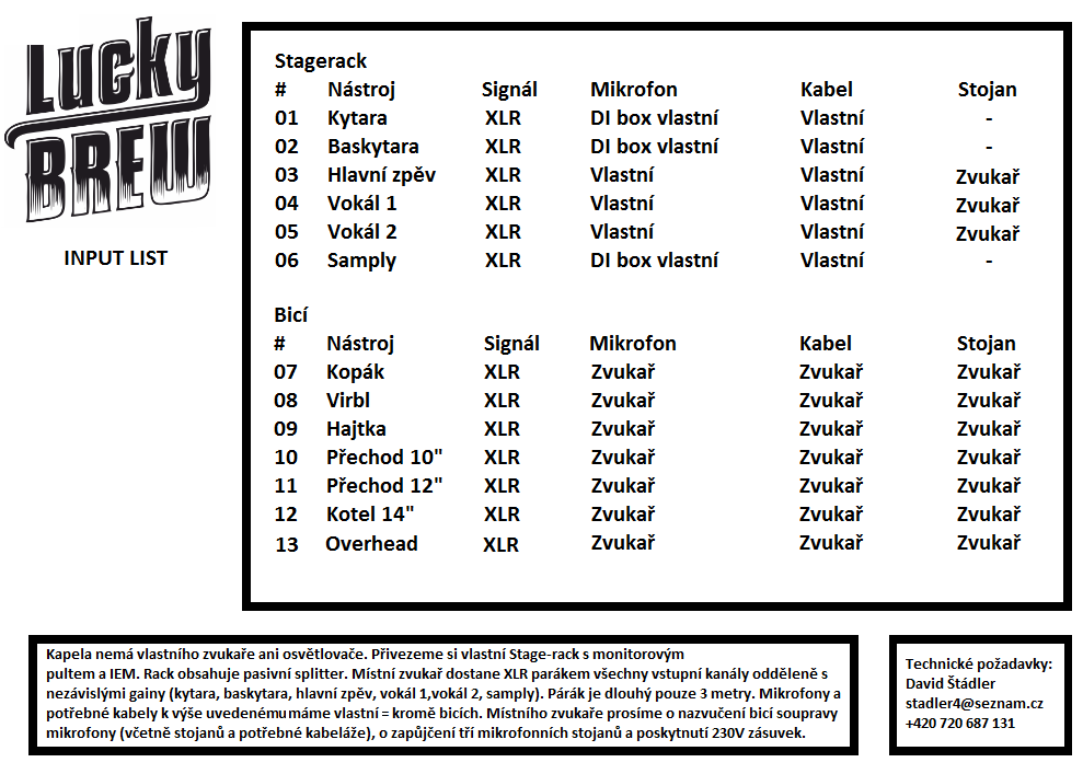 Nedávno jsme s kapelou přešli na IEM rack systém s mixem a splitterem. Vytvořil jsem aktuální Stageplan a Inputlist