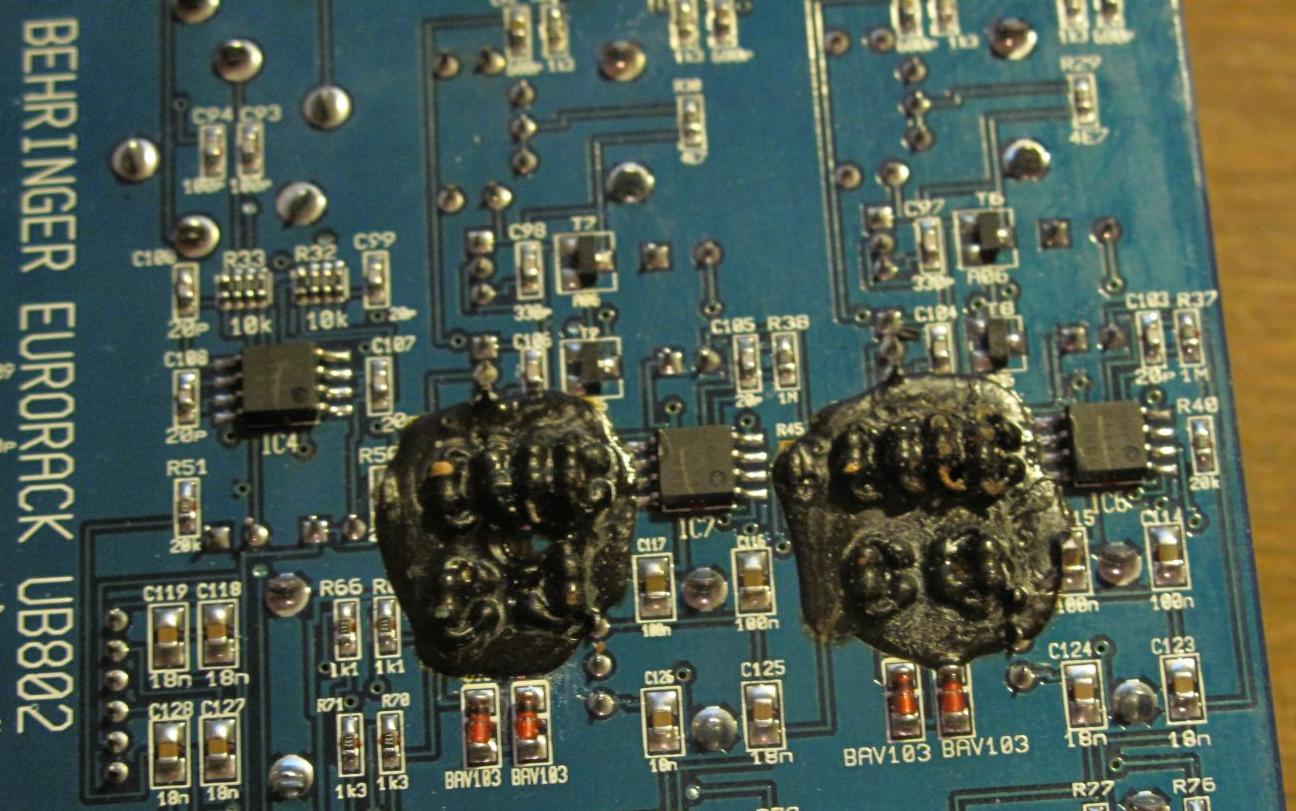 Dostal se mi do ruky mixáček Behringer UB802 a má odkouřené obě mikrofoní šavle, někde v místě předzesilovače. Za prvním operákem už je v pořádku. Bohužel se v tomto mixu asi stala zoufalost v návrhu a tak tam je kolem toho prvního operáku (IC6 a na druhé šavli IC7) hromádka šesti odporů, kde se nejspíš počítalo že to budou SMD a následně tam asi kvůli teplu dali klasické s nožkama a zalili je nějakým černým hnusem. Protože tím hnusem jsou zalité i šroubky, předpokládám, že je to originál z výroby a ne nějaká oprava. Zřejmě ale součástky s nožičkama moc nepomohly a usmažily se časem stejně, jako by to udělala ta SMDčka. Kvůli černému hnusu ale není vidět ani cesty na plošném spoji, ani popisky součástek. Nemáte někdo verzi bez toho fixačního hnusu a nebo jiný zdroj informací, který odpor je který? Hnus drží dost poctivě, takže bych ho asi sundal i s popiskama nebo i s cestama. Schéma stažené mám. Pomohlo by mi asi to rozmístění součástek, nebo tip čím se černý hnus dá bez újmy na DPS rozpustit. Děkuju