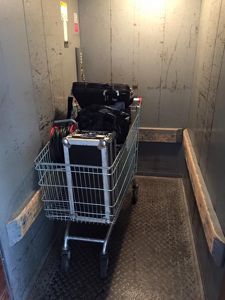 Bezproblémový vjezd k venkovním proskleným dveřím v přízemí pravého rohu budovy. Výtahem, kde sotva rozpažíš do 2. p. Pak pár schodů z chodby na jeviště. Čekají vás 3 nezávislé přívody 3 x 380V (stáří nezastavíš, všemu je minim. 30 let). Nad jevištěm tři funkční tahy.