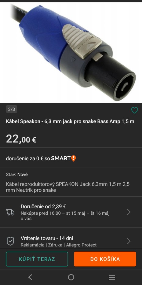 Toto nie to je adaptér - redukcia. Môže byť ten čo si dal skôr screen tie pro snake nepoznám ale konektory majú kvalitné buď neutrik/rean alebo amphenol. Podľa mňa kľudne aj lacnejšiu verziu pro snake TPL 1,5 LP https://www.thomann.de/intl/pro_snake_tpl_15_lp_2.htm nájdeš to aj na allegre s Thomanna je drahé poštovne keď je do 200€ tak to činí až 15€. Aj ten lacnejší má rean takže mal by byť v pohode, možno ten Bas ma odolnejší aj kábel na foto vyzerá hrubšia izolácia, ťažko posúdiť. Hlavne či dĺžka 1,5m vyhovuje, ak nie tak podľa potreby ale hlavne ber prierez 2x2,5mm2 t.j. z týchto: vyfiltrovaný zoznam repro káblov jack-speakon
